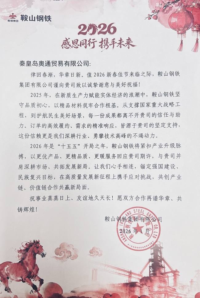 近日,我司秦皇島奧通貿(mào)易有限公司收到來(lái)自鞍山鋼鐵集團(tuán)有限公司的2026年新春賀函。這份來(lái)自國(guó)內(nèi)鋼鐵行業(yè)領(lǐng)軍企業(yè)的誠(chéng)摯祝福,既是對(duì)過(guò)去一年合作成果的高度認(rèn)可,也是對(duì)雙方未來(lái)共贏發(fā)展的深切期許。
